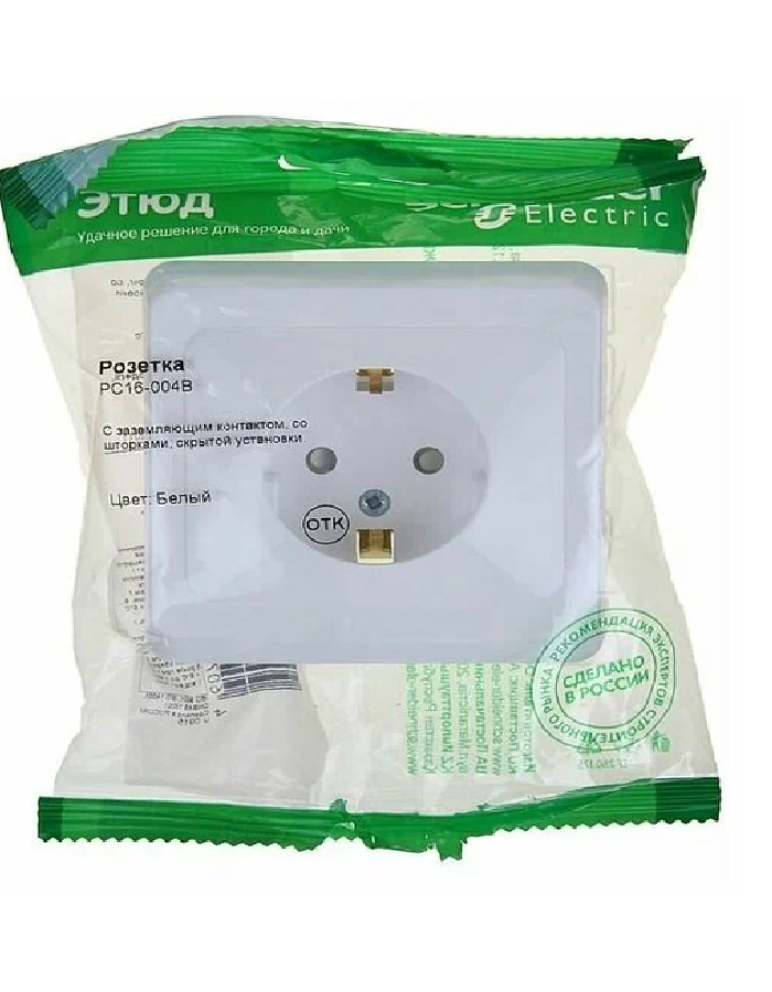Розетка Systeme Electric (ранее Schneider Electric) ЭТЮД (белый, скрытой установки) одноместная, с заземлением и шторками предназначена для применения в сетях до 250В, на ток до 16А. Шторки открываются при одновременном давлении в оба отверстия и препятствуют проникновению посторонних предметов. Они обеспечивают дополнительную безопасность в доме, где находятся дети. Сделано в России.