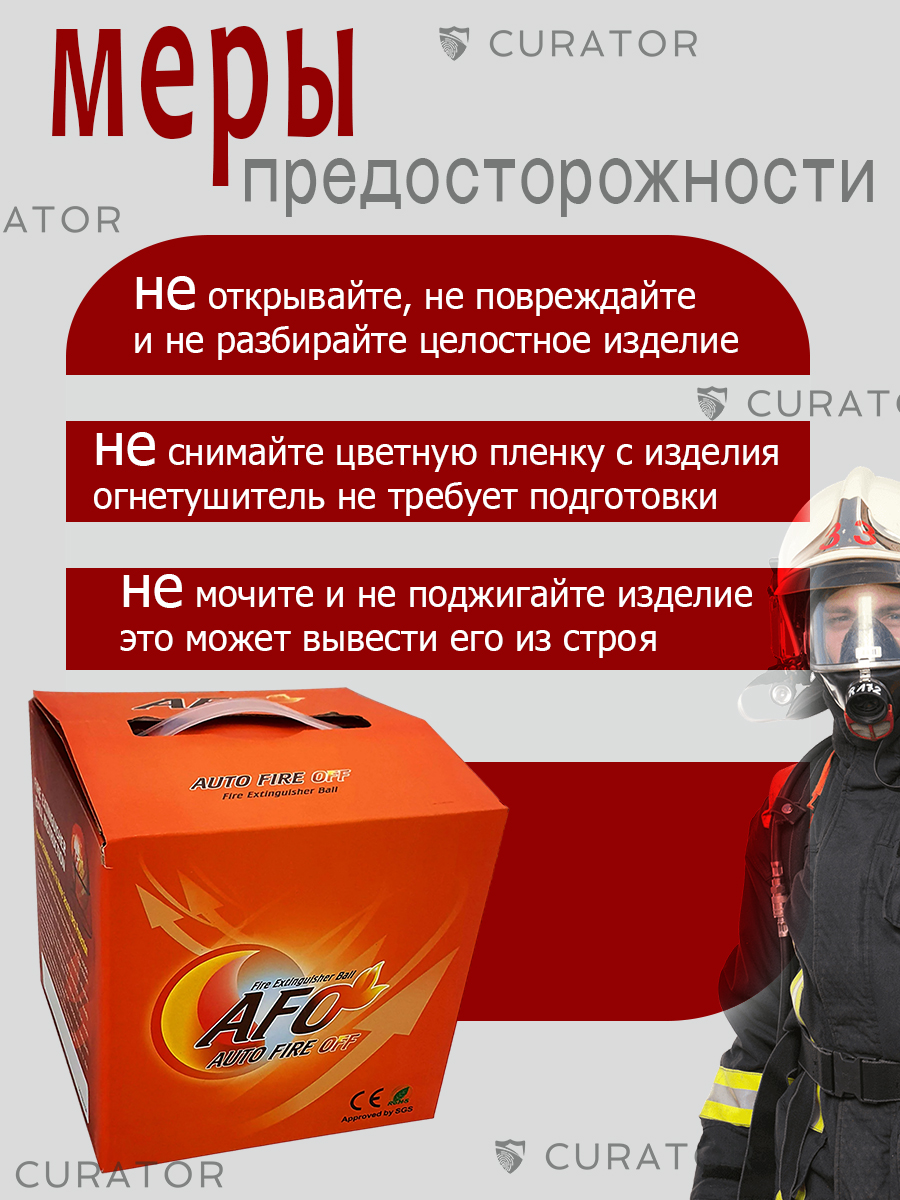 ШАР-AFO это самосрабатывающий модуль пожаротушения, который активируется при контакте с открытым огнем, что полностью исключает ложные срабатывания в случае высокой температуры окружающей среды или разрушения его корпуса.Устройство ШАР-AFO может использоваться как первичное средство пожаротушения в детских садах, школах, больницах, гостиницах, квартирах, частных домах и т.д. Благодаря своим универсальным характеристикам устройство ШАР-AFO может также использоваться как автономный модуль пожаротушения, который при возникновении возгорания сработает самостоятельно в отсутствие человека. Для этого его согласно инструкции необходимо разместить на расстоянии 25-30 см над пожароопасной зоной. Площадь тушения 3м 3