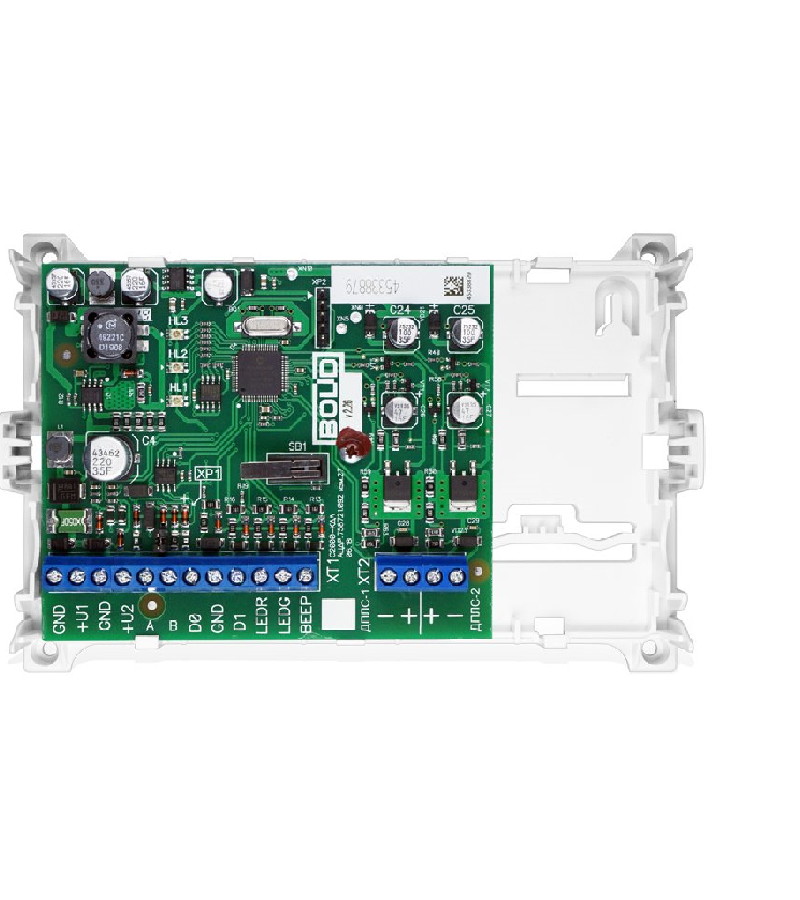 Контроллер двухпроводной линии связи для применения в составе интегрированной системы охраны "Орион"; до 127 адресов, U-пит.10.2...28.4 В, I-потр.400 мА, два входа питания; RS-485, TouchMemory, до 512 кодов ключей, буфер на 512 событий; IP40, t-раб.-30…+55°C, 156х107х39 мм